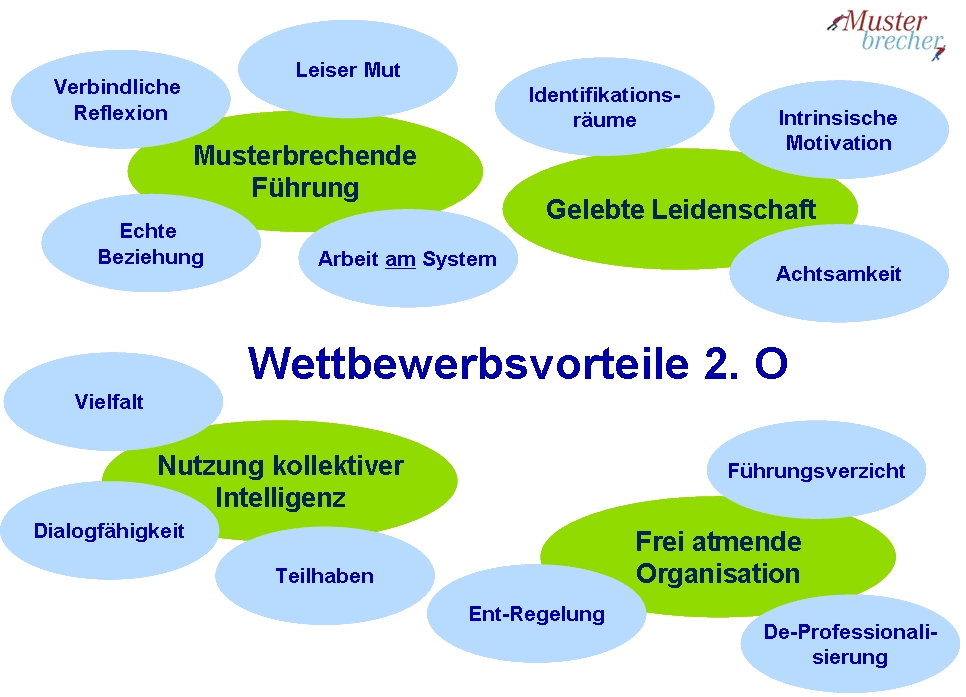Im Gegensatz zu den klassischen Wettbewerbsvorteilen, wie Produktinnovationen oder starke Marken, handelt es sich bei den „Wettbewerbsvorteilen 2. Ordnung“ (2.O) um „kulturelle“ Alleinstellungsmerkmale: Mitarbeitende, die Freiräume erfahren, sich mit Leidenschaft einbringen und ihre Intelligenz voll der Organisation zur Verfügung stellen. Für den Aufbau der Wettbewerbsvorteile 2.O werden Leader benötigt, die ihre Rolle primär als Kontextgestalter verstehen, die also reflektieren, von anderen lernen und experimentieren.